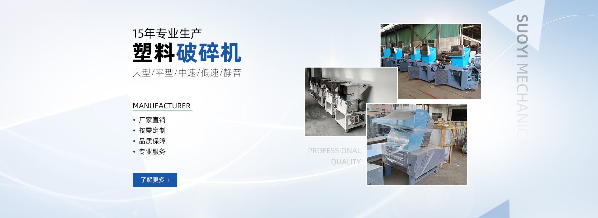 東莞市索億塑料機(jī)械設(shè)備廠(chǎng)專(zhuān)注于塑料周邊設(shè)備的生產(chǎn)與制造15年,公司成立于2006年,現(xiàn)有廠(chǎng)房占地10000平,員工近200人,專(zhuān)業(yè)生產(chǎn)高速碎料機(jī)、中速碎料機(jī)、低速碎料機(jī)等塑料破碎機(jī);臥式攪拌機(jī)、立式拌料機(jī)等攪拌機(jī)設(shè)備;塑料干燥混色機(jī)、混合機(jī)混料機(jī)、工業(yè)冷水機(jī)組、模溫機(jī)、溫控箱、烤料斗、真空吸料機(jī)等注塑機(jī)周邊設(shè)備。 公司以“索科技之精華,億國(guó)際之品質(zhì)”為目標(biāo),一直與時(shí)俱進(jìn),始終走在科技與市場(chǎng)的前沿,憑借著準(zhǔn)確的把控、優(yōu)異的操作性能,使索億迅速搶占市場(chǎng),不僅暢銷(xiāo)國(guó)內(nèi),還遠(yuǎn)銷(xiāo)國(guó)外。索億以其強(qiáng)大的技術(shù)背景和豐富的客戶(hù)服務(wù)經(jīng)驗(yàn)為核心,致力于向客戶(hù)提供價(jià)格優(yōu)惠的高品質(zhì)的注塑機(jī)周邊設(shè)備。產(chǎn)品性能穩(wěn)定、安全耐用。 索億塑料機(jī)械經(jīng)過(guò)多年的努力和研究,在十多年的塑料機(jī)械制造行業(yè)中,已形成了專(zhuān)業(yè)、成熟、可靠的設(shè)計(jì)、開(kāi)發(fā)、制造各類(lèi)塑料輔機(jī)的生產(chǎn)體系和銷(xiāo)售平臺(tái)。公司生產(chǎn)的各類(lèi)塑膠機(jī)械設(shè)備嬴得了很多客戶(hù)的肯定,特別是在國(guó)內(nèi)市場(chǎng)備受歡迎。主要應(yīng)用于汽車(chē)、電子、建材、化工、包裝等橡塑行業(yè),產(chǎn)品銷(xiāo)往全球,暢銷(xiāo)全國(guó)34省區(qū)。